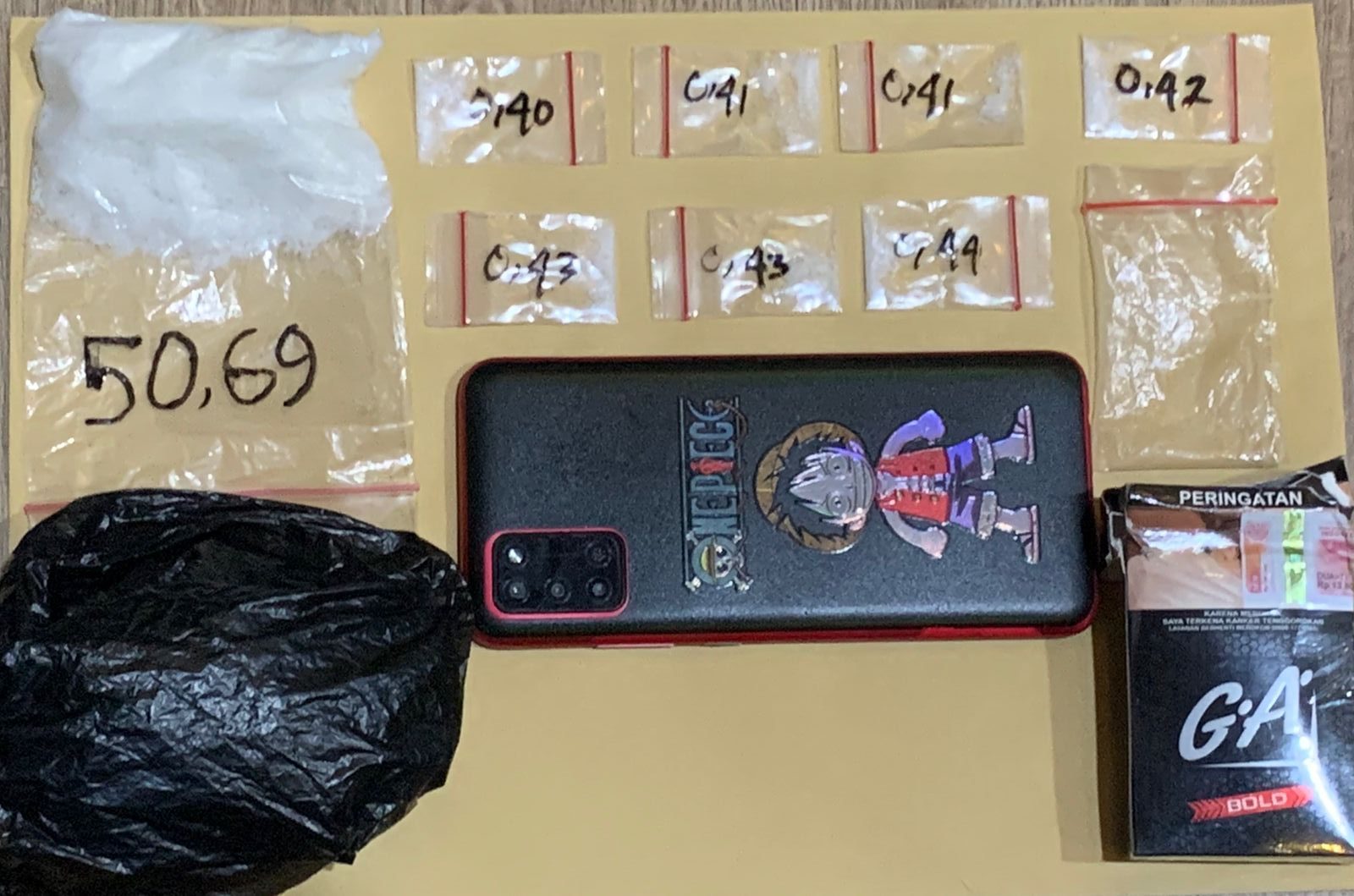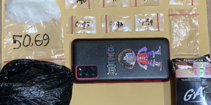 Tambahnya, Saat penggeledahan, polisi menemukan satu kotak rokok hitam merek GA yang berisi satu paket sabu dengan berat bruto 50,69 gram di saku belakang celana pelaku. Selain itu, ditemukan juga satu plastik klip berisi tujuh paket sabu dengan berat bruto 2,94 gram di saku depan celananya, Tutupnya.