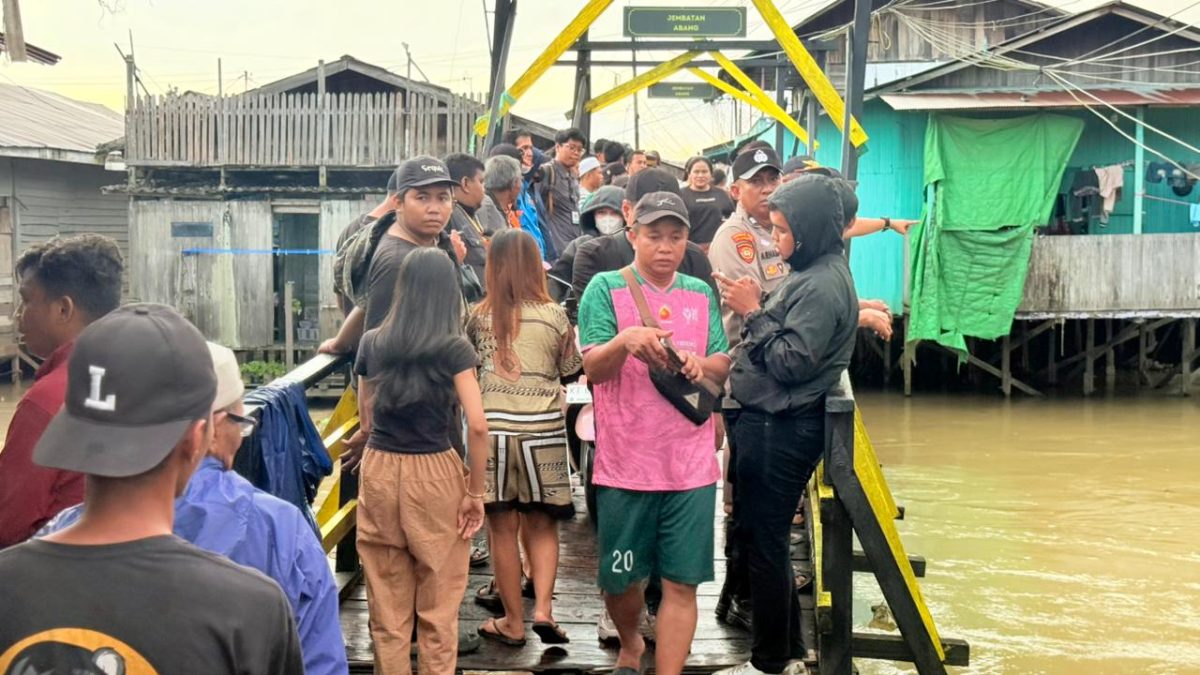 kepolisian dan warga berada di jembatan, lokasi diduga korban terakhir hilang tenggelam (Foto : Fer/Ulasankaltim.id)